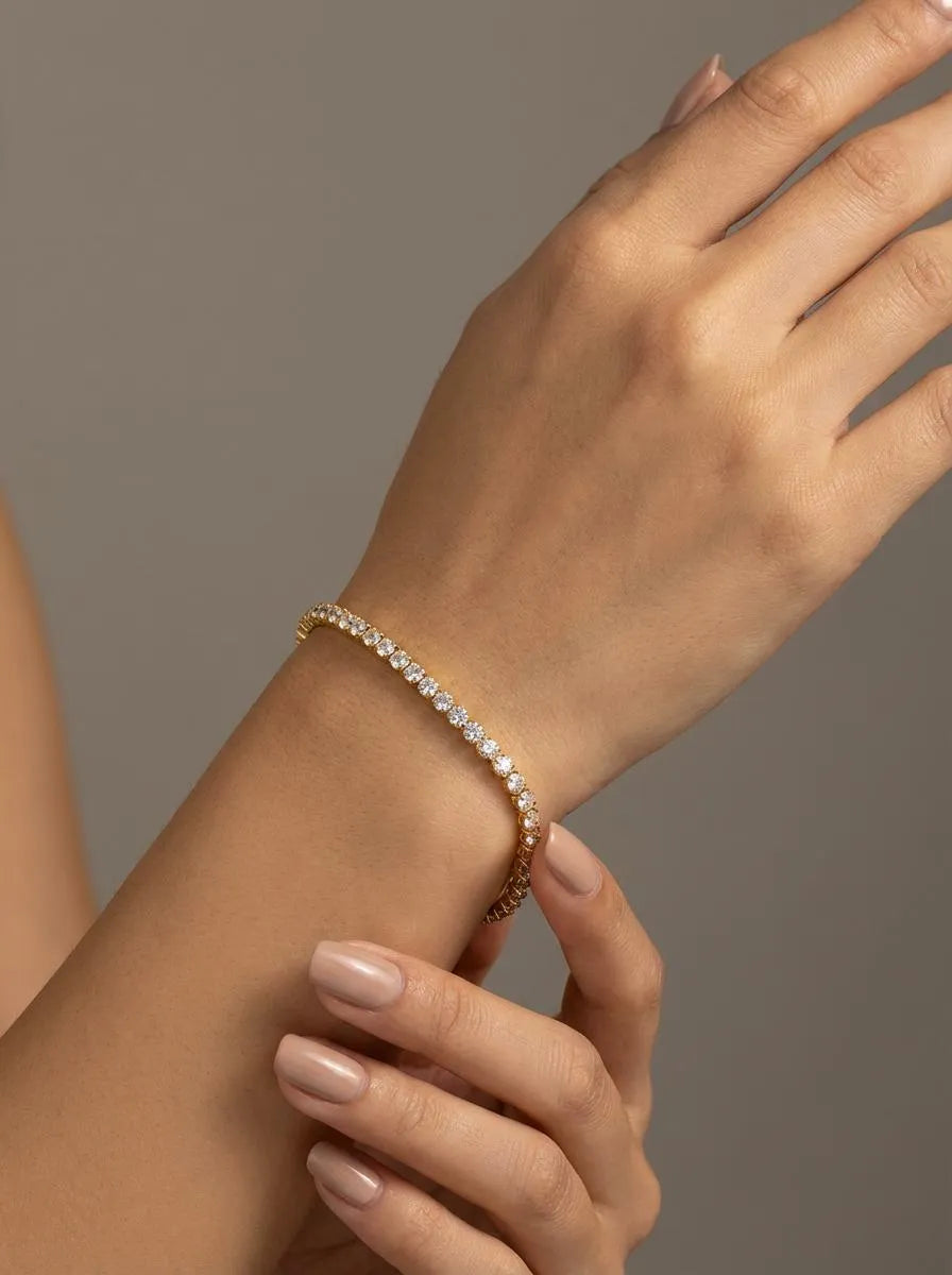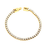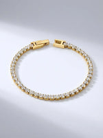 Pozlátený tenisový náramok so zirkónmi s dĺžkou 17 cm. Elegantný šperk s nadčasovým leskom, ktorý zvýrazní každý pohyb tvojej ruky.
