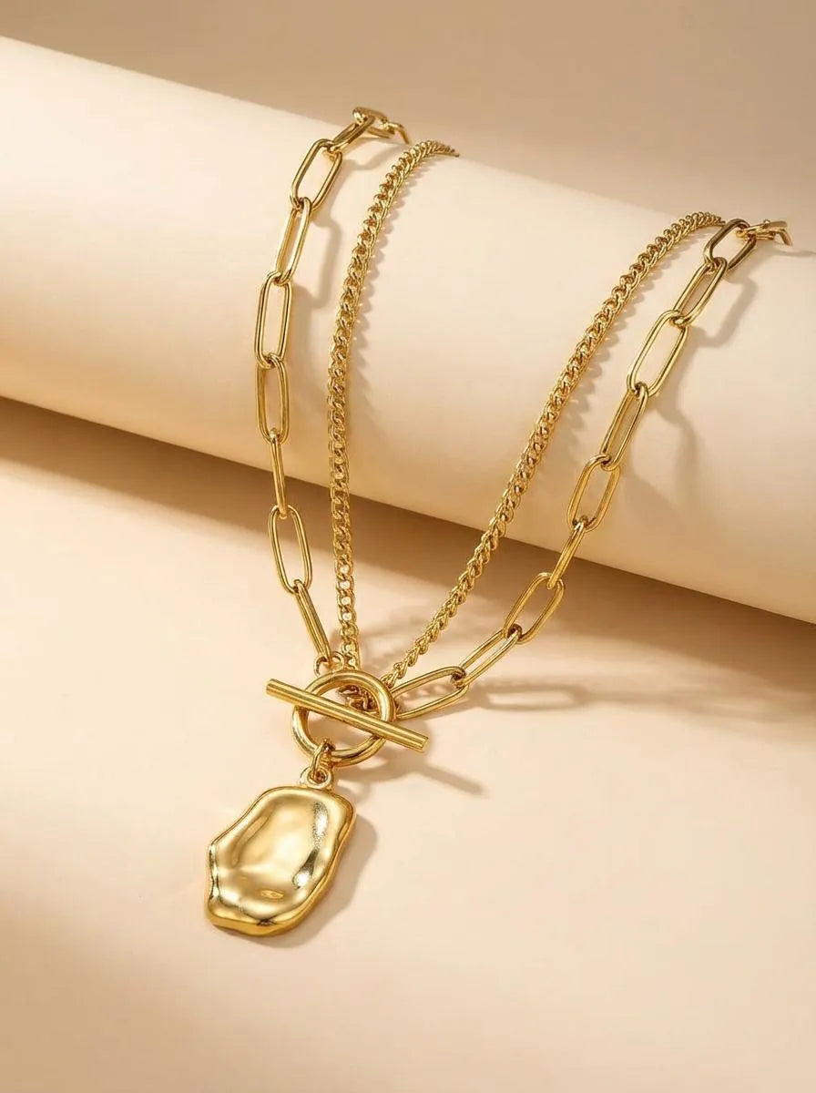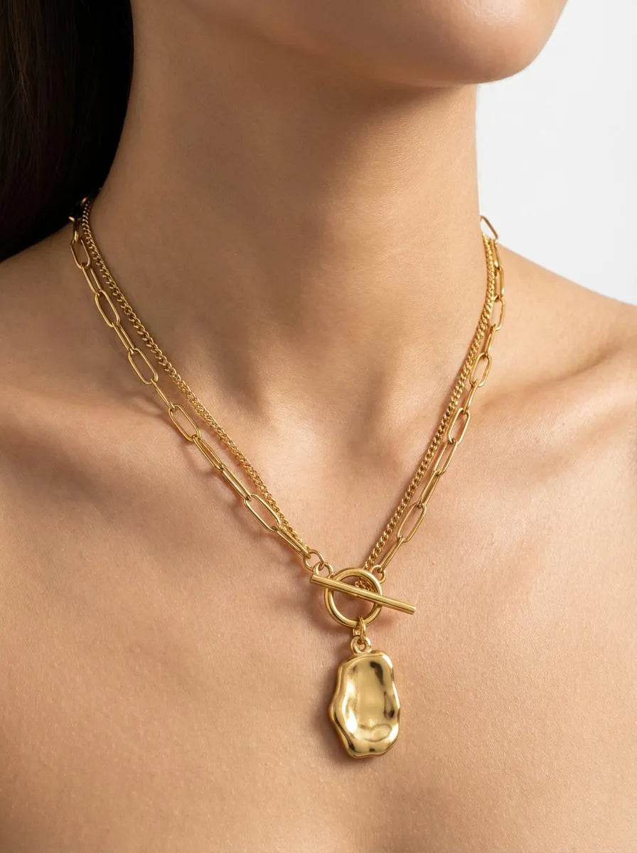 Výrazný zlatý dvojradový náhrdelník s organickým príveskom. Moderný umelecký šperk so sochárskym charakterom a nadčasovým leskom.