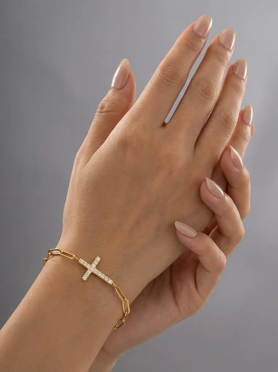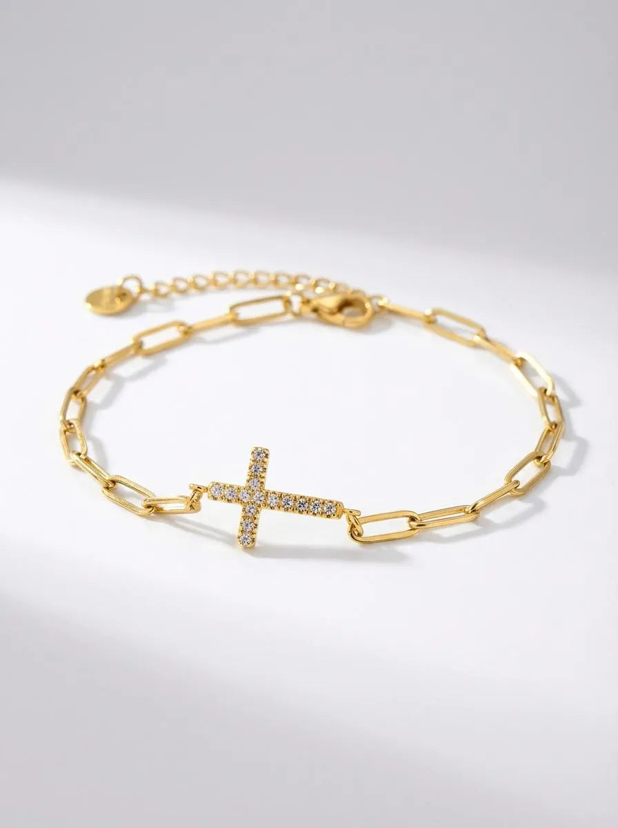 Pozlátený náramok s krížikom zdobeným zirkónmi. Symbol viery a sily v modernom, elegantnom prevedení, ktorý sa hodí ku každému štýlu.