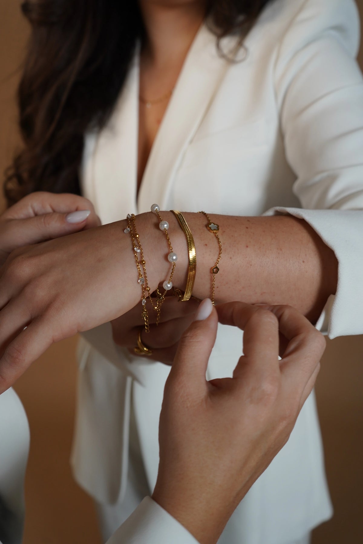 Pozlátený náramok s jemnými kvapkovými krištáľmi. Elegantný doplnok, ktorý prináša decentný lesk a ženskosť do každodenného aj večerného štýlu.