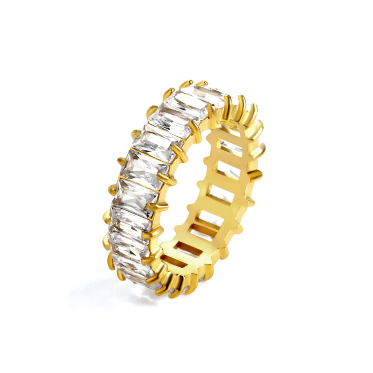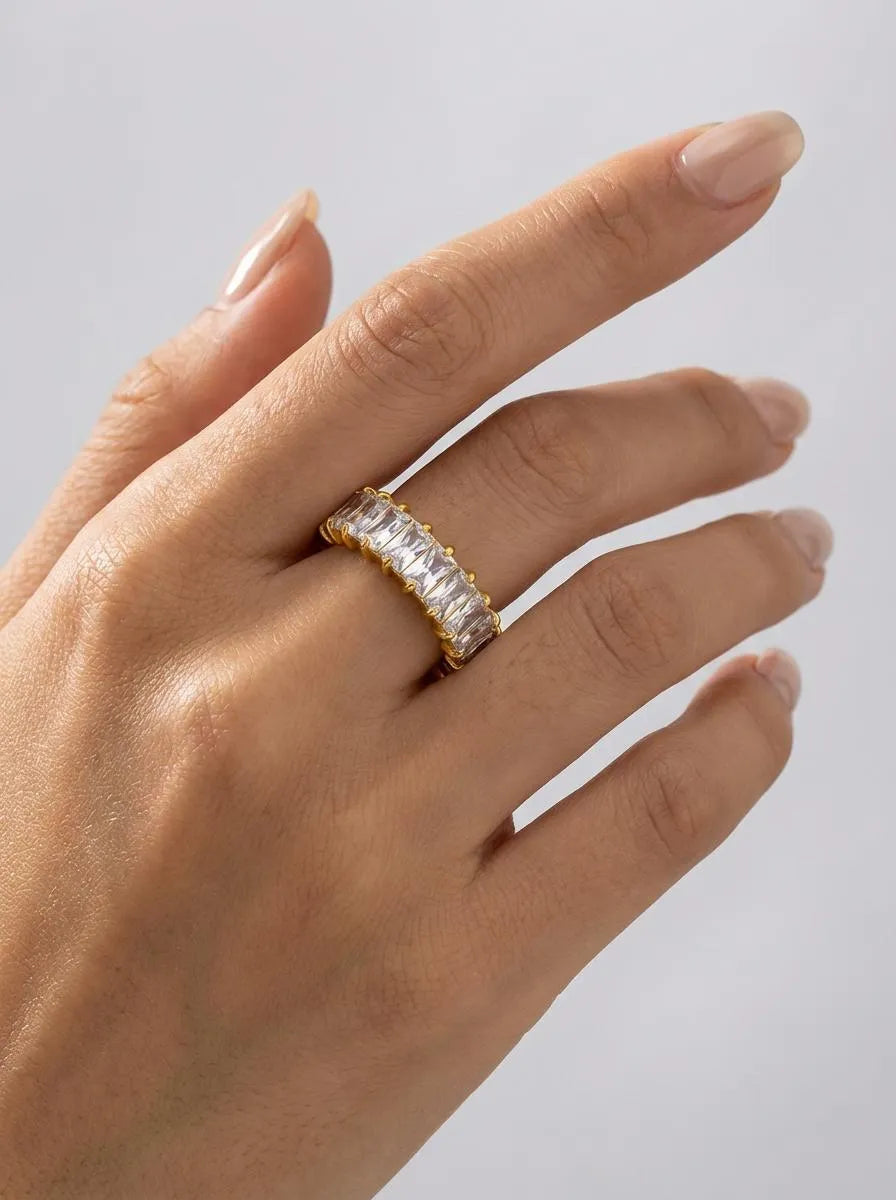 Trblietavý pozlátený prsteň so zirkónmi. Obohať svoju šperkovnicu o elegantný prstienok so žiarivým leskom a nadčasovým štýlom.