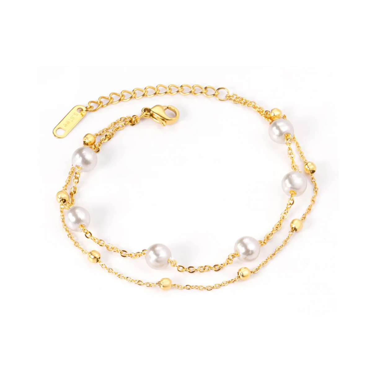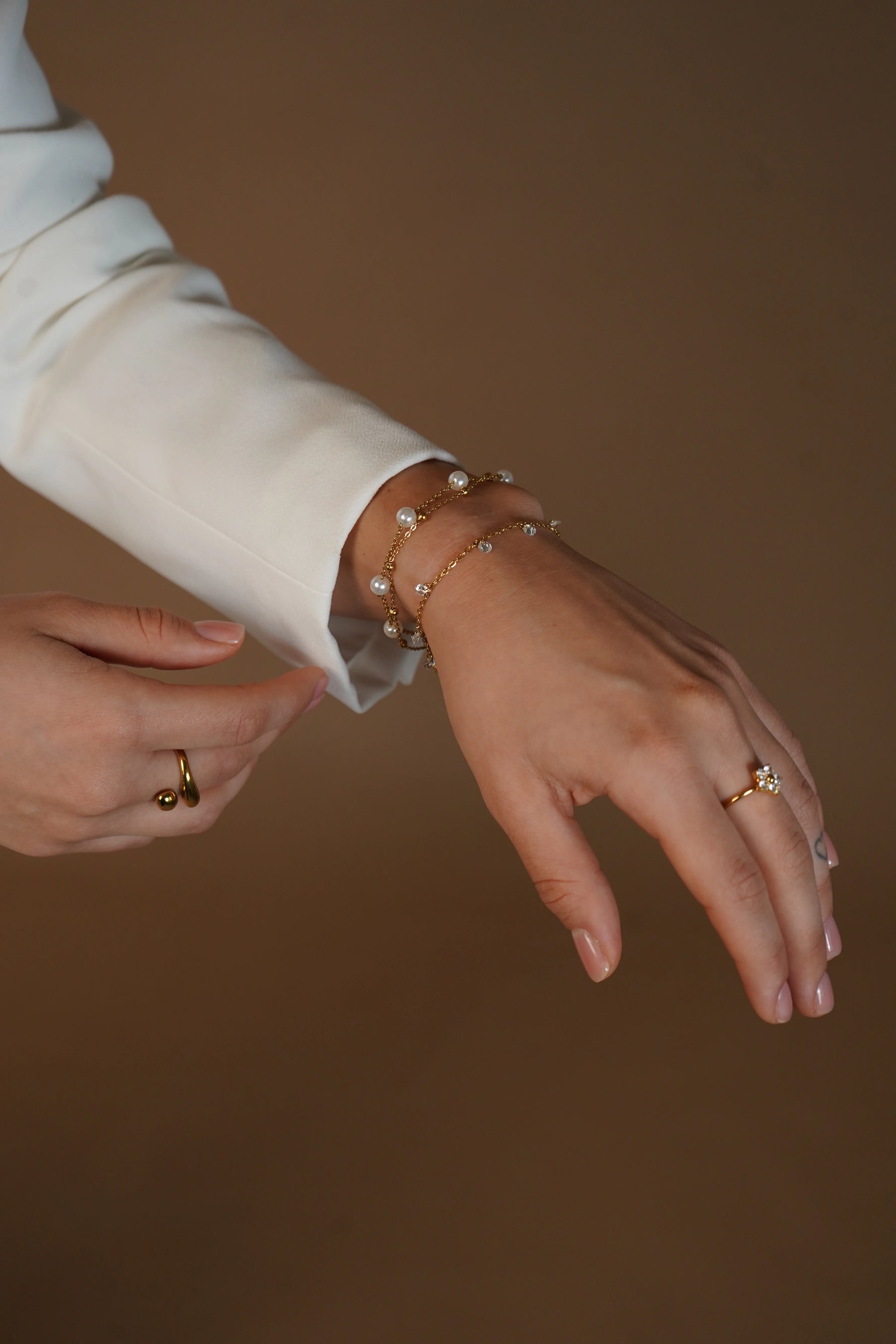 Pozlátený dvojradový náramok zdobený perlami a zlatými detailmi. Jemný, ženský doplnok, ktorý spája eleganciu s prirodzenou jednoduchosťou. Ideálny na vrstvenie aj samostatné nosenie.