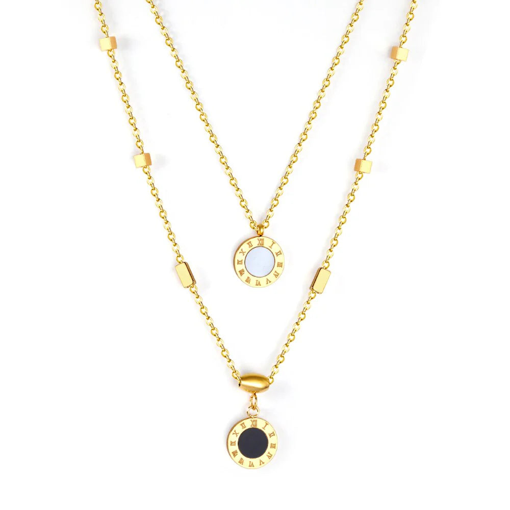 Moderný dvojradový náhrdelník s čiernou a bielou mušľou a detailmi rímskych číslic. Elegantný kontrast, ktorý zvýrazní tvoj štýl.